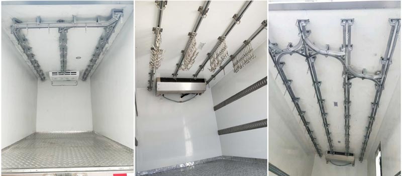 肉勾冷藏車在生產過程中,廂體必須加固,可根據客戶的要求加裝3條,4條,5條滑道。