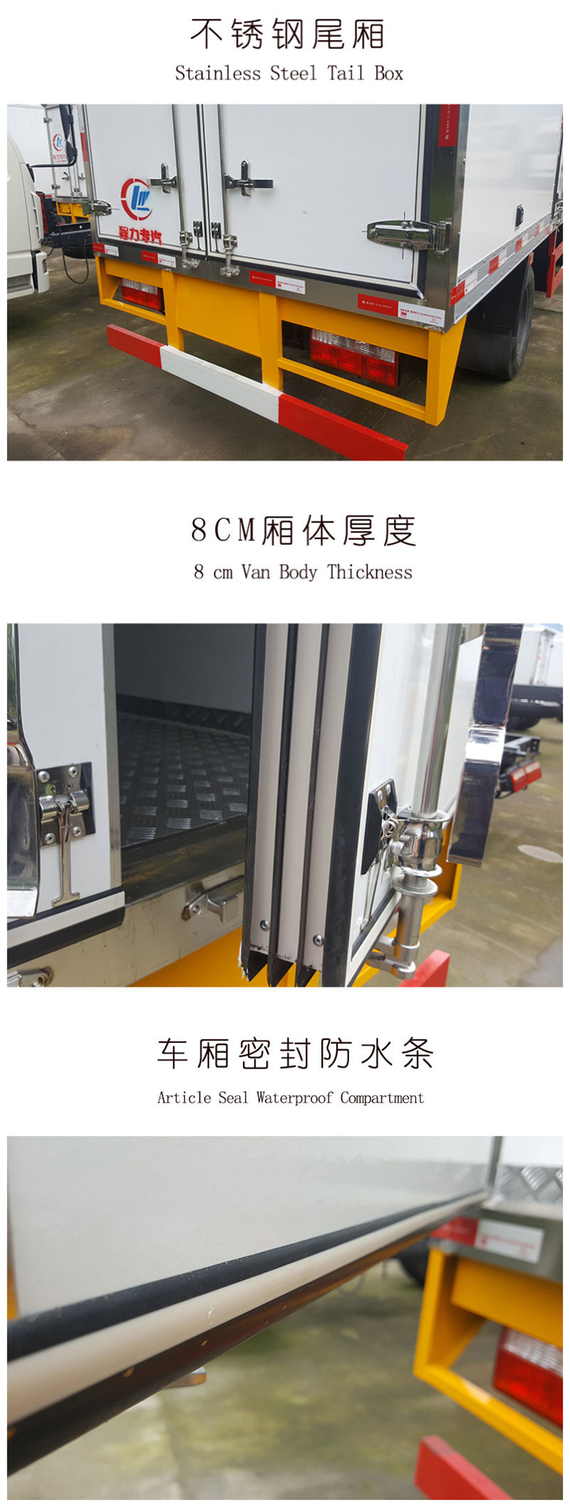 三、選裝配置:可選裝廂體側門(單側門或雙開門),可選裝鋁合金導風槽(導風槽有助于冷氣循環,提升制冷效果),可選裝廂體頂部加固肉勾滑道(直滑道 或 對接互通式拐彎滑道)??蛇x裝廂體內部采用全面不銹鋼材質(海鮮運輸必須加裝,海水有腐蝕性),可選裝280V-380V外接電源(停車熄火后可插電冷機繼續制冷工作),可選裝溫濕度監控記錄儀(帶打印功能)。